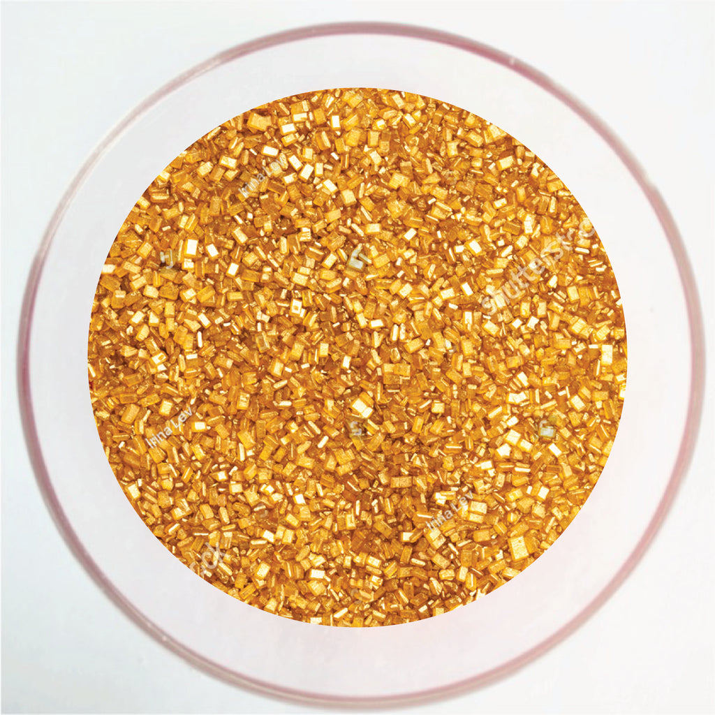 cristales de azúcar comestibles, de color dorado y tamaño grueso (chunky), usados para decoración de postres como cupcakes, pasteles y galletas, aportando un toque brillante y metálico.