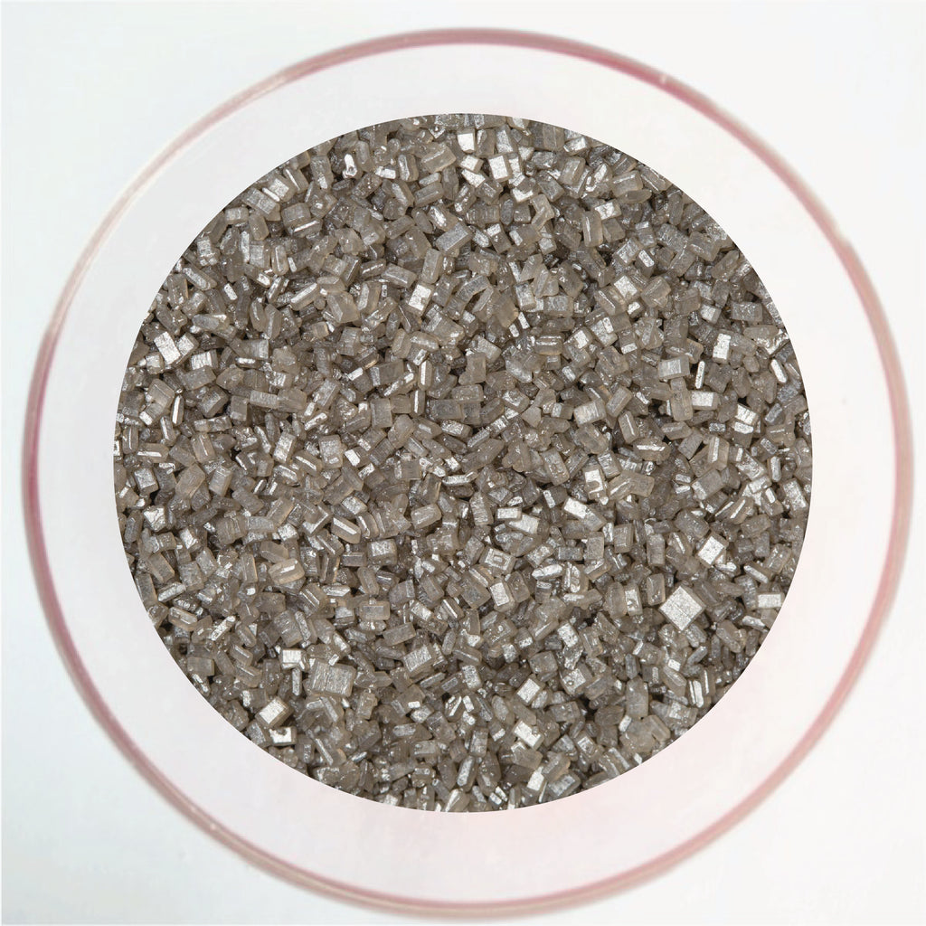 cristales de azúcar comestibles color plateado, usados para decoración de postres como cupcakes, pasteles y galletas, aportando un toque brillante y metálico